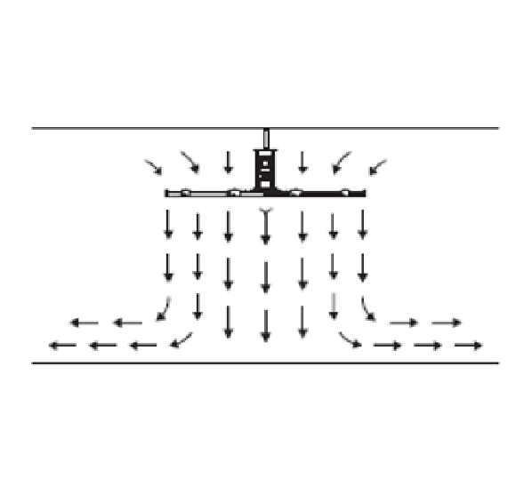 為安全和大化風量分布, 使扇葉產(chǎn)生的風量從扇葉移向地板。當氣流撞擊地板時,風量從地面偏轉(zhuǎn)向外移動到四周。