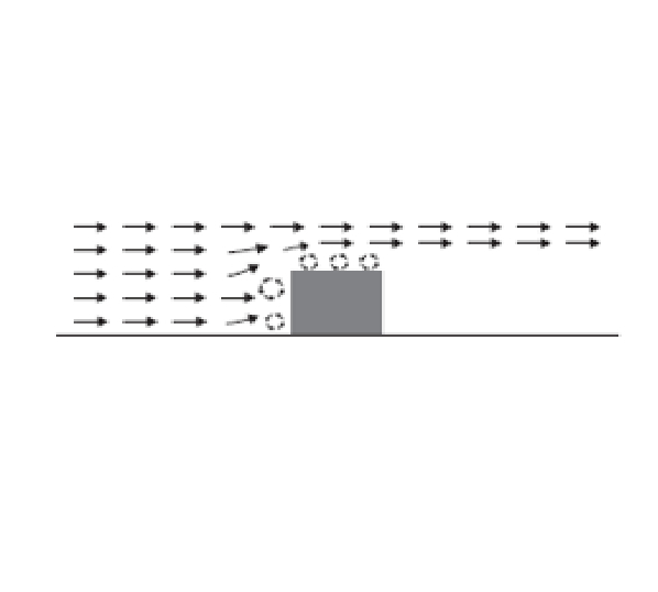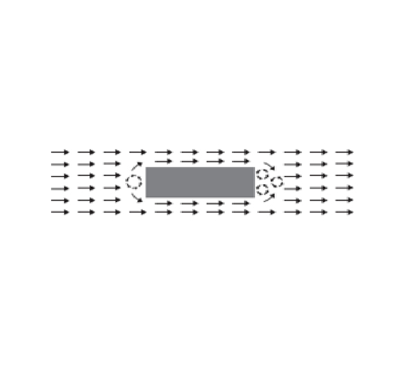 地面的障礙物會阻礙空氣流動, 小的或流線型障礙物不會阻塞太多的空氣流動, 但當氣流遇到大的障礙物,氣流會失去部分動力,并在部分區(qū)域產(chǎn)生空氣停滯(沒有風)。氣流通過大障礙物,空氣流會改變方向向上, 障礙物后面將不會有氣流通過。