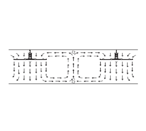 氣流到達地面后偏轉(zhuǎn)向外輻射, 氣流遇到墻或設備阻擋物,氣流開始向上偏轉(zhuǎn)達到屋頂, 向上的氣流向風扇上方的低壓區(qū)域然后在將其拉向地板。這個類似對流。
